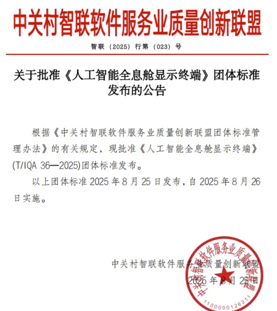 2025年8月25日,中关村智联软件服务业质量创新联盟发布公告,批准《人工智能全息舱显示终端》(T/IQA 36—2025)团体标准发布。该标准由国术科技联合中关村智联软件服务业质量创新联盟等单位牵头起草。