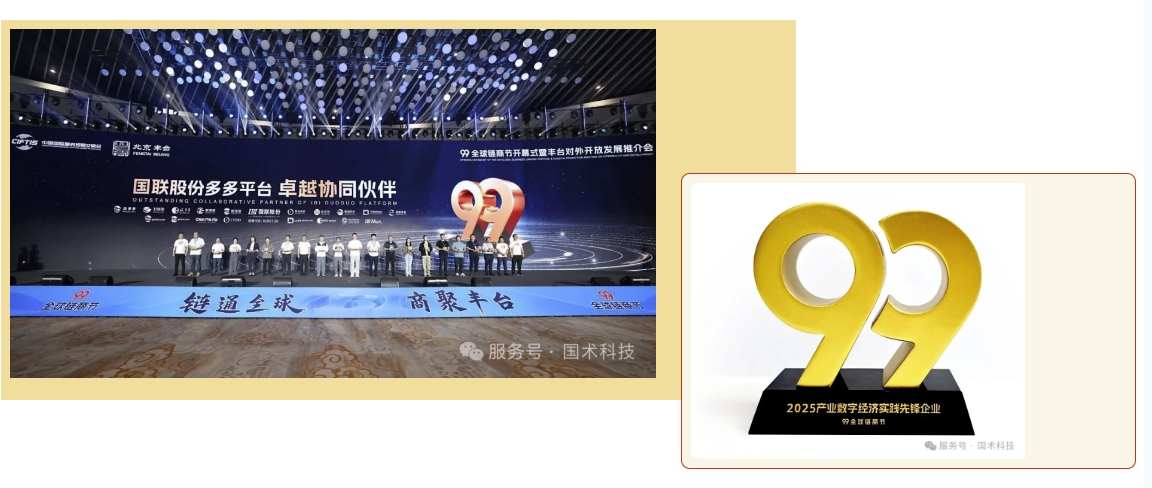 9月9日,以“链通全球 商聚丰台”为主题的99全球链商节开幕式暨丰台对外开放发展推介会在北京园博大酒店举办。该活动由国联股份主办,吸引政府领导、各国使领馆代表、全球供应链龙头企业、国际商务机构等约1500人齐聚,共话链商经济发展,共推丰台对外开放新篇章。国术科技作为国联股份供应商之一,受邀参加此次活动,并在国联股份数字经济总部展示了最新AI科创成果“OBVerse奥比全息舱+复刻数字人”。会上,国术科技获国联股份“2025产业数字经济实践先锋企业”授牌。