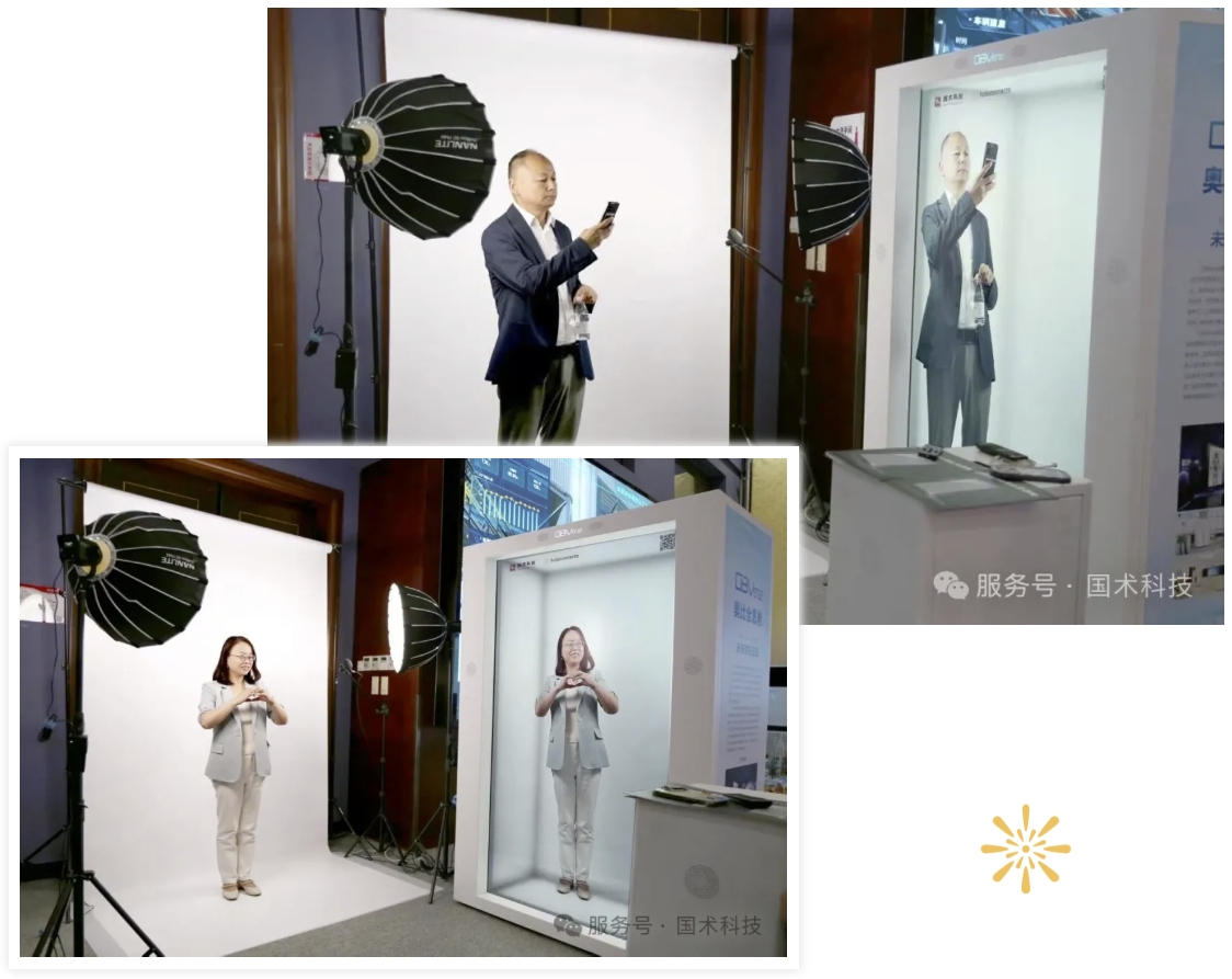 在国联股份数字经济总部的展示现场,国术科技带来的神奇舱体引起嘉宾关注。原来,大家看到,多个企业家的数字分身陆续出现在舱里,热情地给大家介绍自己和自家企业。这个舱体就是“OBVerse奥比全息舱”,而企业家的数字分身是利用全息舱配套的复刻系统复刻而来,通过全息舱播放,呈现出4K超高清的裸眼3D视觉效果,1:1还原真人。在工作人员的邀请下,众多感兴趣的嘉宾进行了体验,和实时生成的“数字人分身”互动并合影留念。