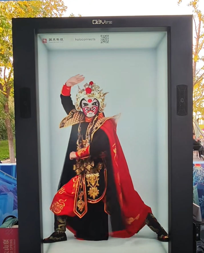 与此同时,国术科技带来的“戏曲服饰AI换装”产品也吸引了众多戏曲迷体验。“真实的戏曲角色装扮少说几个小时,现在挥挥手就能穿上俏丽的花旦服,扮上精致的花旦妆,这可太酷啦!”一位年轻女戏迷感叹道。“戏曲服饰AI换装”提供了花旦、青衣、刀马旦、小生、老生、武生等多种戏曲服饰,体验者通过手势操作即可选择其中一种“上身”试穿。试穿图像会在“OBVerse奥比全息舱”中以4K超高清裸眼3D的形式精彩呈现,让体验者沉浸式体验戏曲服饰的美学魅力与文化风情。同时,体验者还可以扫码保存标有活动主题词的高清图像,构建“体验-留存-分享”的完整闭环,助力戏曲服饰文化广泛传播。