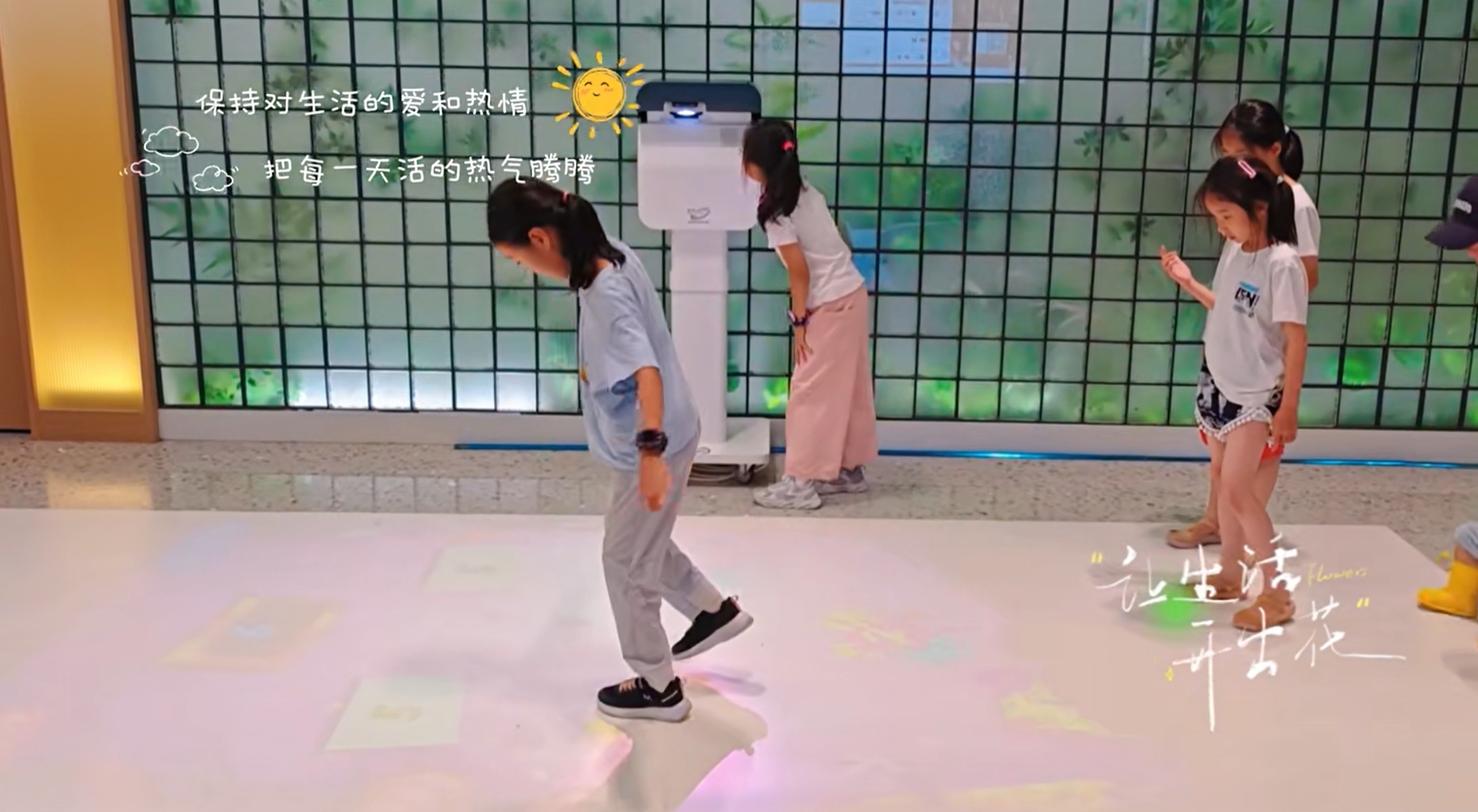 与此同时,D15生活美学馆里,“赛未来商用教育游戏机器人”打造出一方科技感与童趣交织的探索天地。成群结队的小朋友们被吸引而来,沉浸式体验交互投影游戏。他们尽情地蹦蹦跳跳,通过脚步与画面中的内容互动,一会儿相互对战,一会儿协同合作,玩得不亦乐乎。该产品采用了全球领先的交互投影技术和先进算法,运行流畅,能投射出丰富的趣味科普节目,营造出沉浸式的科普互动空间,不仅能够帮助孩子在健康运动中快乐学习,还能锻炼和提高孩子自身的反应能力、协调能力、思维能力和社交沟通能力。