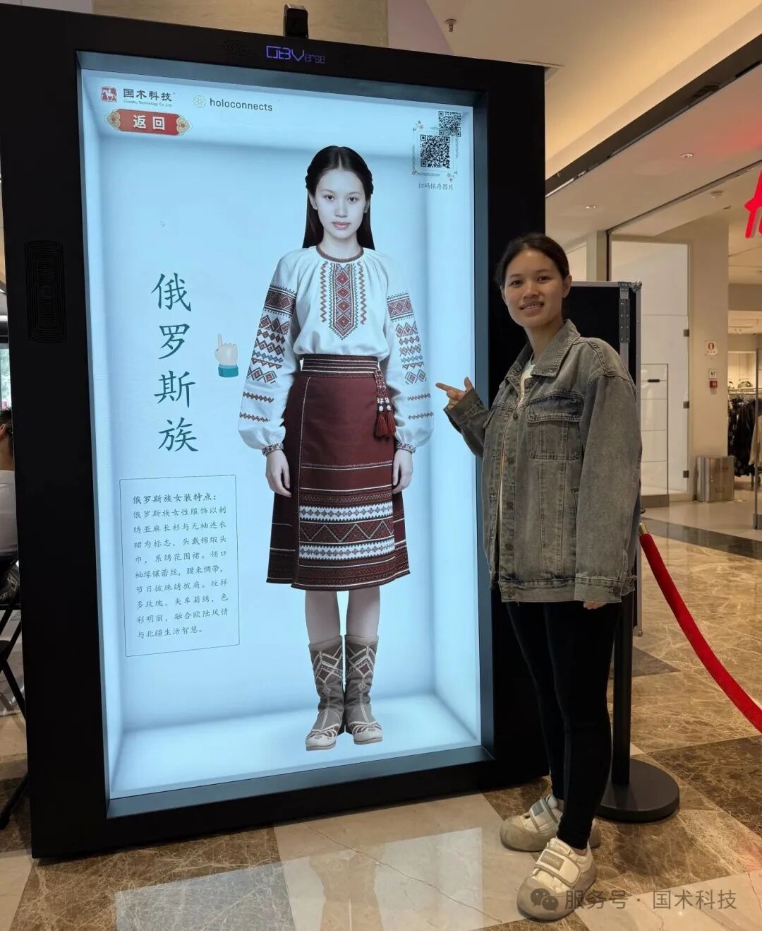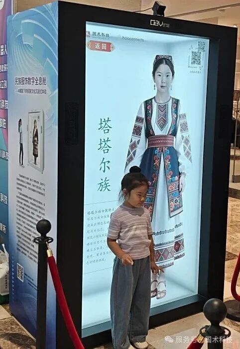 与此同时,国术科技的另一产品“民族服饰AI换装”也受到观众的喜爱。“只要挥挥手,就能瞬间试穿民族服饰,生成美图,现在的科技也太神奇了!”一位体验者感叹道。体验者通过手势操作即可轻松选择心仪的民族服饰“上身”试穿,试穿图像会在“OBVerse奥比全息舱”中以4K超高清裸眼3D的形式精彩呈现,让体验者沉浸式体验民族服饰的美学魅力与文化风情。同时,体验者还可以扫码保存标有活动主题词的高清图像,构建“体验-留存-分享”的完整闭环,助力民族服饰文化广泛传播。
