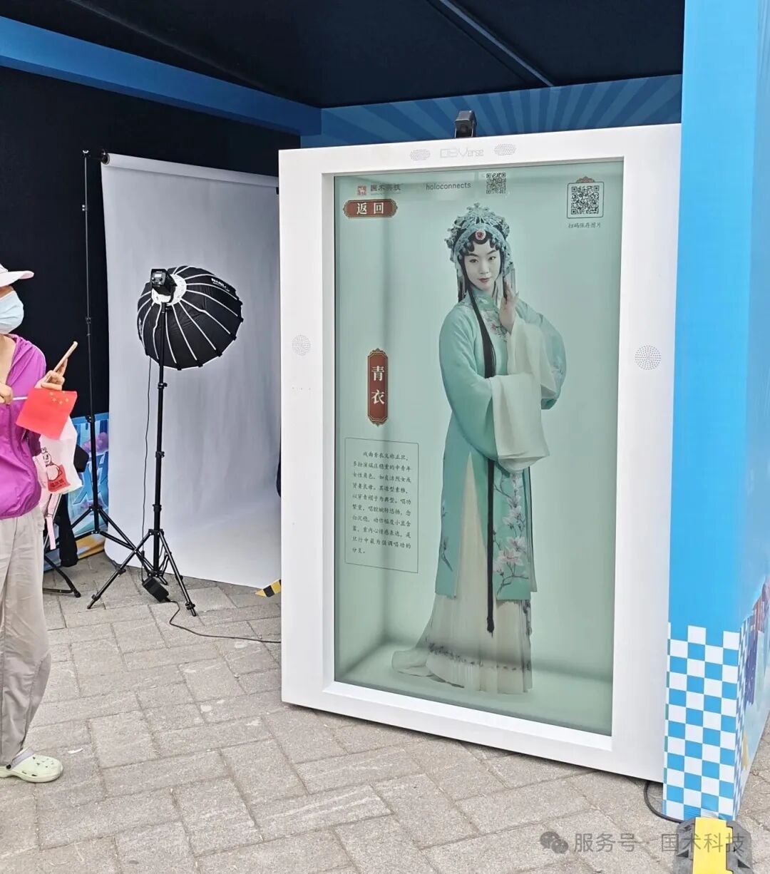 与此同时,国术科技带来的“戏曲服饰AI换装”产品也吸引了众多戏曲迷体验。“真实的戏曲角色装扮少说几个小时,现在挥挥手就能穿上俏丽的花旦服,扮上精致的花旦妆,这可太酷啦!”一位年轻女戏迷感叹道。“戏曲服饰AI换装”提供了花旦、青衣、刀马旦、小生、老生、武生等多种戏曲服饰,体验者通过手势操作即可选择其中一种“上身”试穿。试穿图像会在“OBVerse奥比全息舱”中以4K超高清裸眼3D的形式精彩呈现,让体验者沉浸式体验戏曲服饰的美学魅力与文化风情。同时,体验者还可以扫码保存标有活动主题词的高清图像,构建“体验-留存-分享”的完整闭环,助力戏曲服饰文化广泛传播。