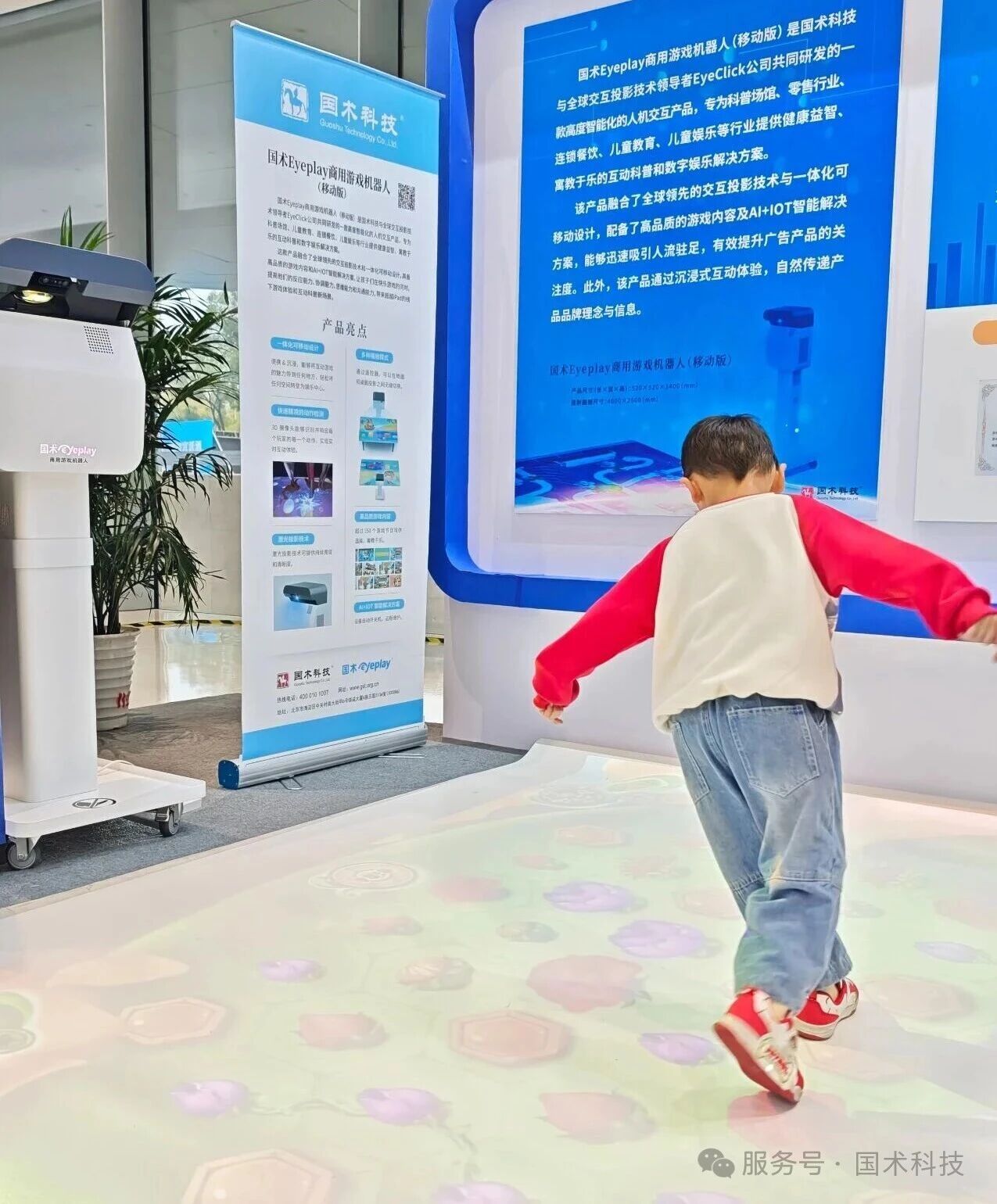 “国术Eyeplay商用游戏机器人(移动版)”是国术科技与全球交互投影技术领导者EyeClick公司共同研发的一款高度智能化的人机交互产品,专为科普场馆、零售行业、连锁餐饮、儿童教育、儿童娱乐等行业提供健康益智、寓教于乐的互动科普和数字娱乐解决方案。该产品融合了全球领先的交互投影技术与一体化可移动设计,配备了高品质的游戏内容及AI+IOT智能解决方案,能够迅速吸引人流驻足,有效提升广告产品的关注度。此外,该产品通过沉浸式互动体验,自然传递产品品牌理念与信息。2021年12月,国术科技主导制定的《游戏用人工智能交互式投影设备》团体标准入选“中关村标准”,填补了国内外该类产品标准的空白。2022年8月,“国术Eyeplay商用游戏机器人”获得中关村标准“1字标”产品认证。2023年10月,该标准被评为“2023年全国工商联商会团体标准‘领先者’”。目前,国术科技的交互投影科普游戏机器人产品已广泛应用于中国科学技术馆、北京科学中心、中科院幼儿园、北京海淀区北下关街道残联、秦皇岛特殊教育学校、北科养老科普展厅、麦当劳餐厅等场景。同时,产品还出口到欧、美等国家和地区。